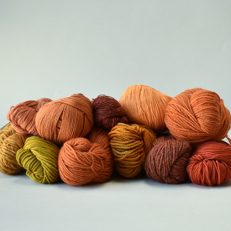 Bottom row (l to r): Cedar House Yarns Windfall Super Bulky in Ginger; O-Wool O-Wash Chunky in Mustard Seed; Erika Knight British Blue 100 in Tulip (this will be launched within the next week!); Jorstad Creek Arranmore in Saffron Spice; Erika Knight Wild Wool in Swagger; and Cedar House Yarns Sapling Sock in Robin Red Breast.