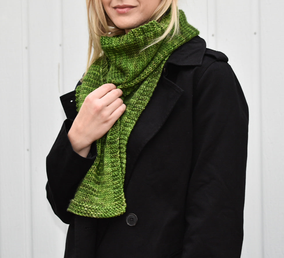 Our Kits have everything you need to make the scarf - just choose your yarn and color. Our model is in Jorstad Creek Arranmore in Sour Apple.