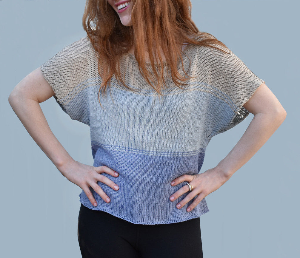 We love Erika Knight's design aesthetic and yarns (and her, for that matter). We thought we'd do a gradient take on her Siena Design. The model above is in our version - inspired by the beach. We knit it up in a Medium using Erika Knight Studio Linen in Pyjama (Color A), Kanoko (Color B), and Bone (Color C).
