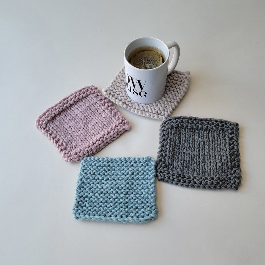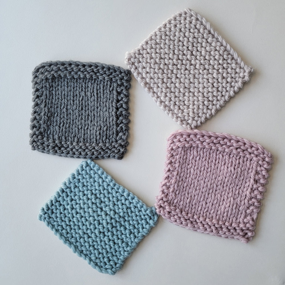 With our Free Beginner Tutorial Design, you'll learn how to knit and make coasters. They're a small project, so easy to finish, and a great home project for yourself or to give as gifts. Each coaster will be either a garter stitch square, the easiest of stitch patterns, or a stockinette stitch square with a garter stitch border - your choice.