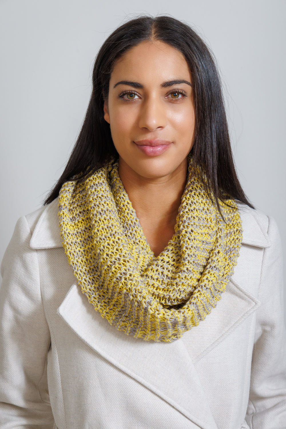 The Eastwind Cowl is a soft, lacy and bouncy cowl that you can wear with a more formal coat, or a more casual one. It's designed with Cedar House Yarns Sapling Sock - you knit with two strands of yarn. Sapling Sock has a bit of nylon, which means that the cowl will keep its shape. Cedar House Yarns designs its special colorways in its studio in Washington State, often inspired by the spectacular nature of the Pacific Northwest.