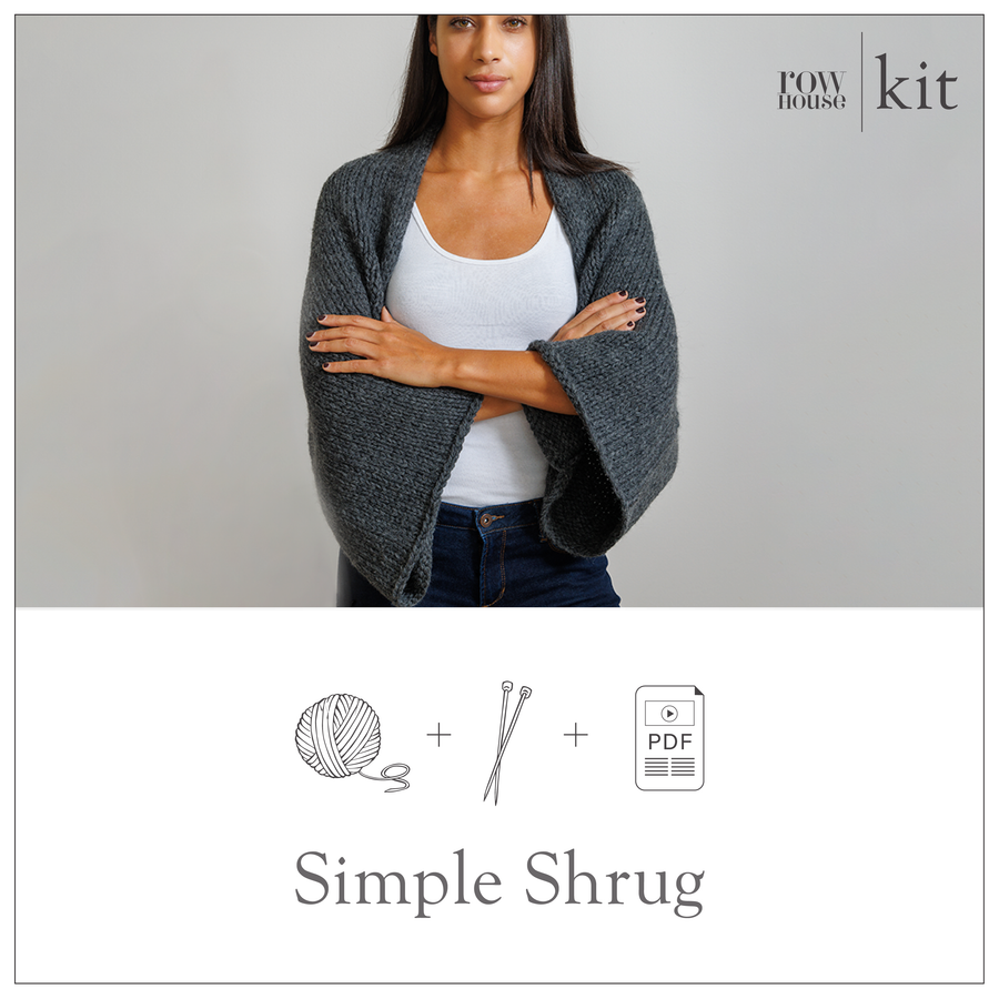 All you need to do is choose a color that you love. The shrug's finished dimensions will be: 29 1/4 (29 1/4, 31 1/2, 33 3/4)" tall, 53 (57, 61, 65)” wide from wrist to wrist.