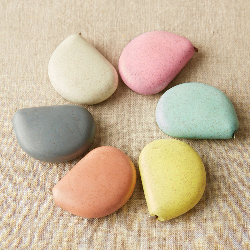 Cocoknits' PLA tape measure comes in six colors; Clay, Linen, Storm, Sea Glass, Mustard Seed, and Wild Rose (red, white, gray, aqua, yellow, and pink). We currently carry the Clay and Linen colors. The bright colors will ensure you can always find it in your project bag. The earth tone colors add a pebble inspired look to your tools. The metal tape inside measures both inches and cm/mm (78" / 2 m long), and has a metal tab on the end to keep it from retracting into the body of the tape measure.