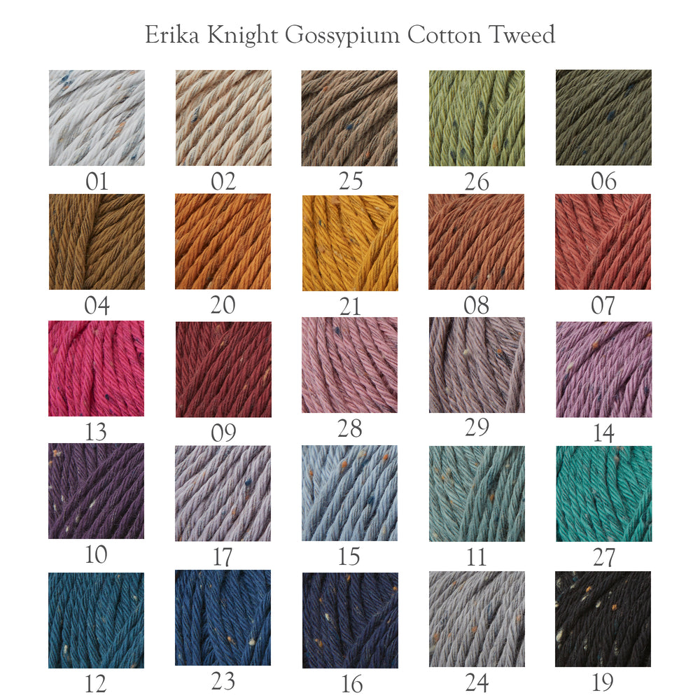 Erika Knight Gossypium Cotton Tweed is a DK weight cotton (with 4% polyester to create the tweed-y look). It is spun in Italy out of Egyptian cotton for a soft and silky cotton with a subtle tweed effect. Gossypium Cotton Tweed can be used interchangeably with Gossypium Cotton.