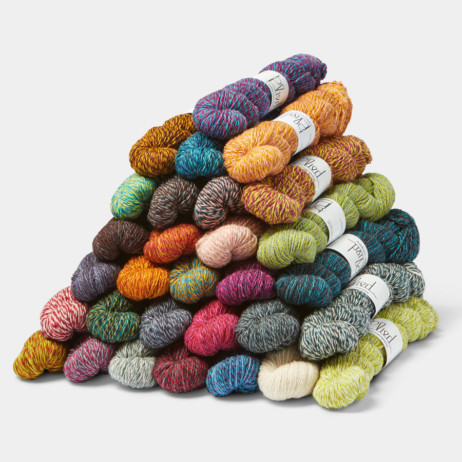 North Ave is a 100% wool, two-ply, woolen spun, fingering weight yarn. Each of the plies is a different colorway, and they are spun together for a truly unique yarn. North Ave is kettle dyed in Baltimore and spun at Harrisville Designs in New Hampshire, and the wool is sourced from New Zealand farms that do not practice mulesing. It's the first yarn from Plied Yarn, a company created by Karida Collins and Ann Weaver.
