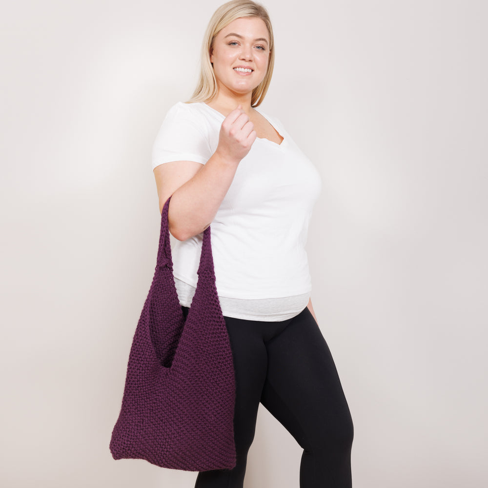 The Market Sac is our winter version of the Street Fair Sac. The Sac is a lightweight tote that you can use to carry your knitting, your reading, and your weekend finds. It is designed by Roni Halloran who you can learn more about here. The Market Sac is designed with Erika Knight Maxi Wool, a wonderful Super Bulky yarn in a fun color palette. Our model is in Mulberry.