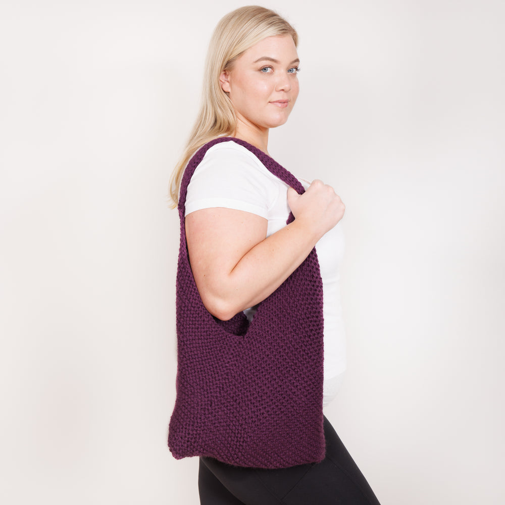 The Market Sac is our winter version of the Street Fair Sac. The Sac is a lightweight tote that you can use to carry your knitting, your reading, and your weekend finds. It is designed by Roni Halloran who you can learn more about here. The Market Sac is designed with Erika Knight Maxi Wool, a wonderful Super Bulky yarn in a fun color palette. Our model is in Mulberry.