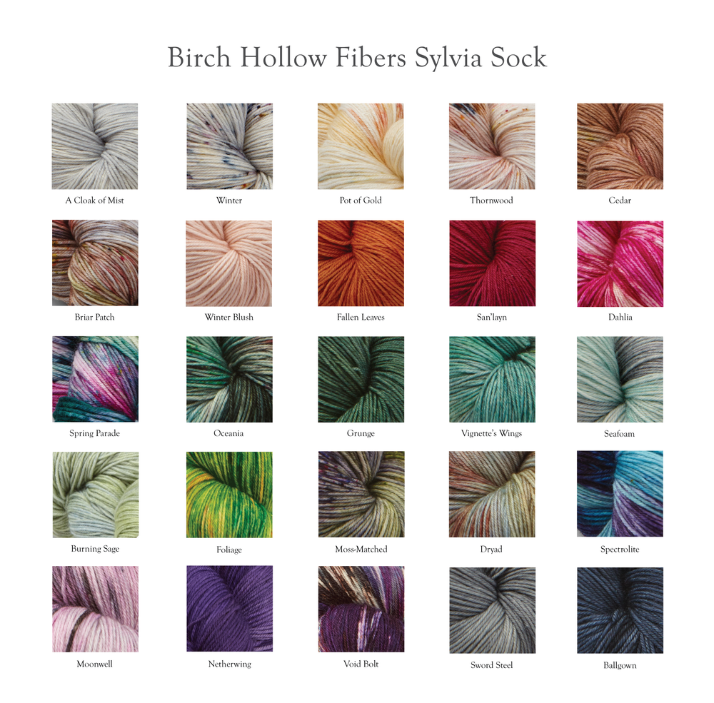 Sylvia Sock is a fingering weight yarn. It is 75% superwash Merino and 25% nylon. It is ethically-sourced from farms where "mulesing" - an inhumane method of raising sheep - is not practiced. Birch Hollow is a member of the Hudson Valley Textile Project which focuses on sustainability and connects farmers, makers, dyers, and more.
