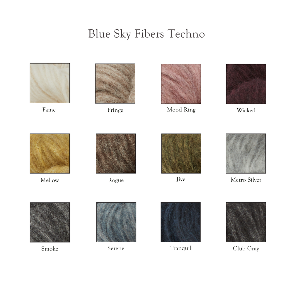 Techno is a fluffy blend of 68% baby alpaca, 22% silk, and 10% extra fine merino wool. It's a versatile bulky weight yarn that will knit up in a range of gauges, depending upon how loose a knit you want. Great for fast knitting with no splitting. Lightweight, it blossoms when it’s blocked. Go ahead and let your creativity bloom. Blue Sky Fibers is sold worldwide and is known for its consciously crafted collection of high-quality natural fibers and patterns.